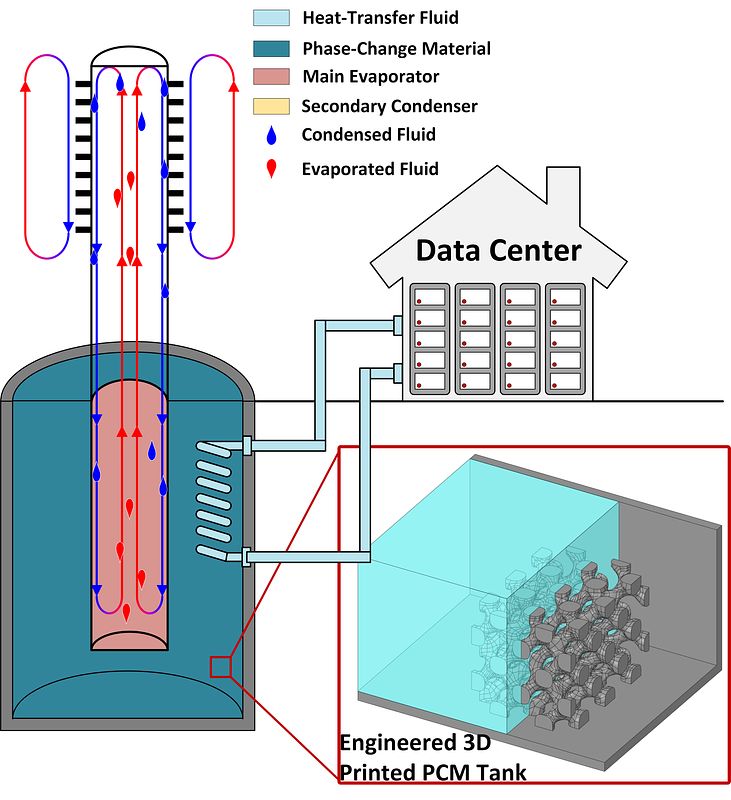 Conceptual design of a cold energy storage/extraction system comprises thermosyphon and energy storage tank.