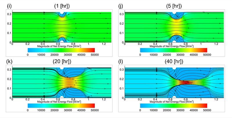 The progression of the frozen body between two freeze pipe under groundwater seepage of 1.4 [m/day] after 1, 5, 20, and 40 hours.
