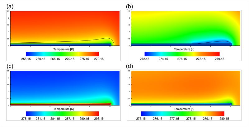 Temperature contours of the frozen domain (black line) and the freezing pipe for (a) Winter (b) Spring, (c) Summer and (d) Autumn seasons.