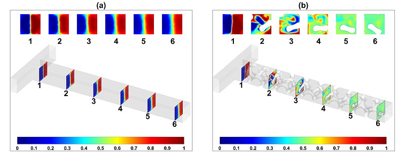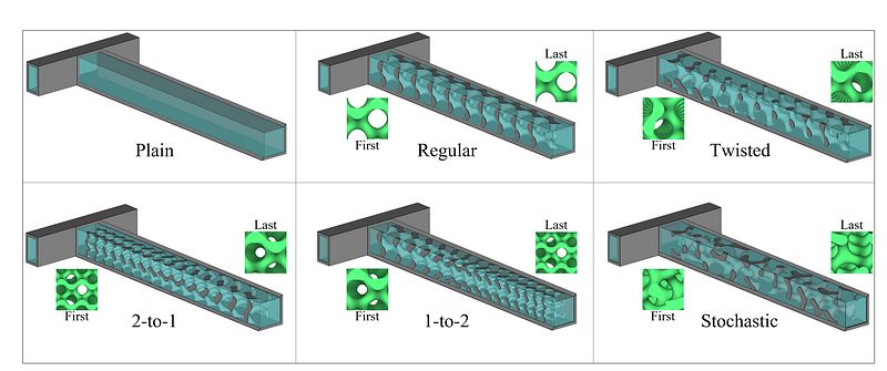 Further, we highlighted the impact of twisted Gyroid on mixing length as compared to a plain micromixer. The twisted Gyroid mixer with a 41% shorter mixing channel was able to deliver a better mixing performance of 135% as compared to a plain micromixer, which means a more compact design, less material, and less pumping power.
