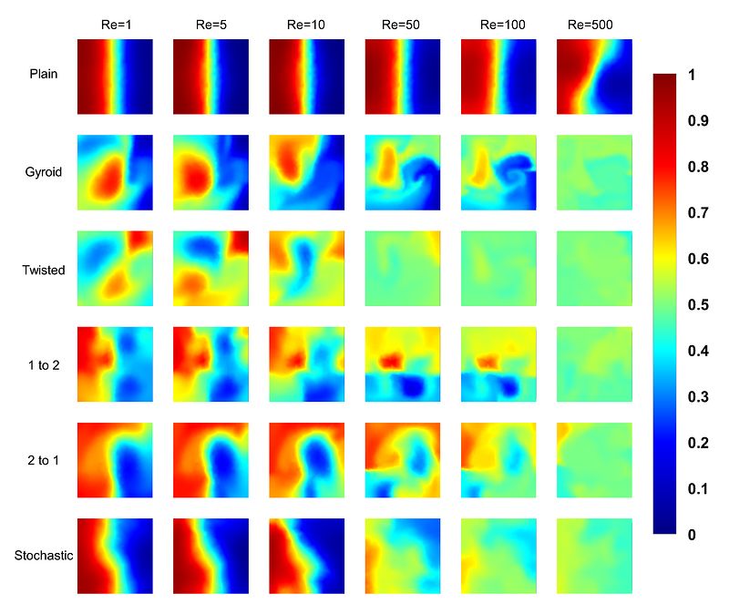 Contours of the mass fraction at the outlet of each micromixer at various Reynolds numbers and Sc = 1000.